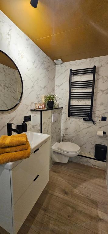 De aparte badkamer is voorzien van alle nodige comfort en beschikt over een regendouche, lavabo en toilet. Zo heb je alle privacy en gemak tijdens je verblijf.